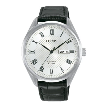 Reloj Lorus RL437BX9 automático para hombre. Reloj con calibre Y676, automático, 40 horas aproximadamente de autonomía. Fron Seiko. Caja de acero y correa en piel negra. Esfera en blanco con doble calendario en la posición de las tres. Índices números romanos y agujas en negro. Corona cambio de hora en la posición de las tres. Tamaño de caja de 42 milímetros. Fondo cerrado a rosca transparente donde se aprecia la maquinaria. Resistente al agua 100 metros. Estuche y garantía Lorus.