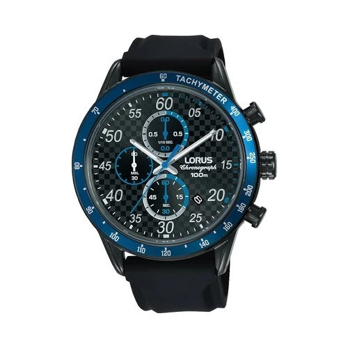 Reloj Lorus rm337ex9 para hombre acero negro silicona esfera negra con azul, bisel azul, cronógrafo, calendario, movimiento japones vd57, Garantía Lorus