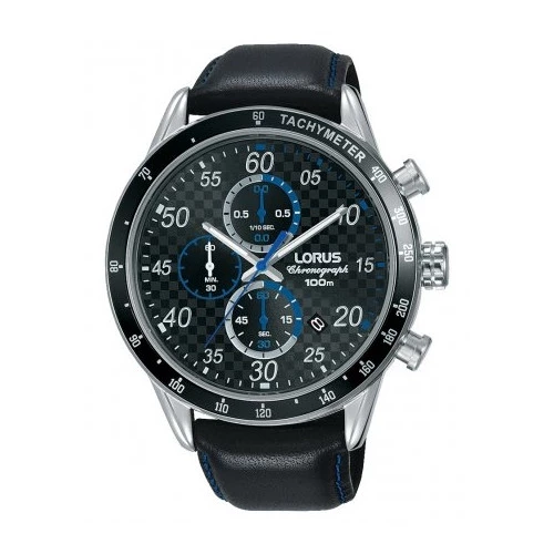 Reloj Lorus caja de acero correa de piel negra con pespuntes azules, bisel en negro