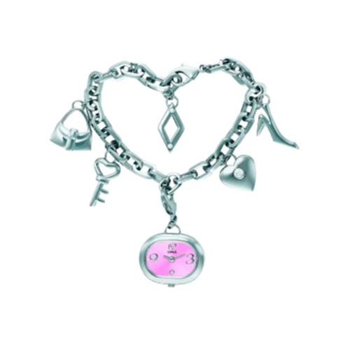 Reloj Lorus RRW45CX tipo joya. Movimiento Japonés fron SEIKO. Caja de acero con pulsera eslabones con charms llave, bolso, corazón, zapato y reloj que cuelga enganchado con mosquetón. Esfera en color rosa con números arábigos y agujas en plateado. Cristal mineral. WR 3 bar, resistente 30 metros. Estuche y garantía oficial Lorus