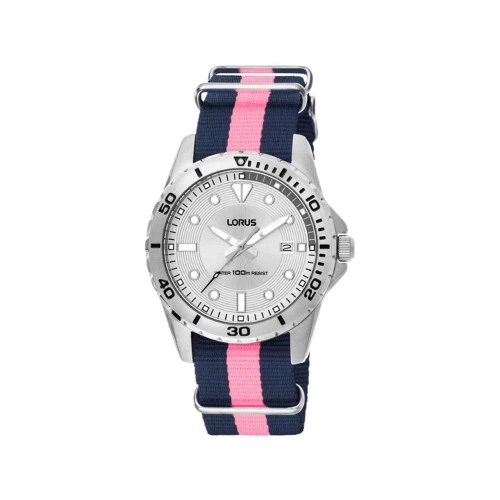 Reloj Lorus caja de acero con correa de nylon lona, en azul y rosa con trabillas de acero,