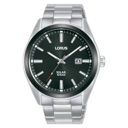 Reloj Lorus RX335AX9 solar para hombre colección Sports. Movimiento Japonés fron SEIKO. Calibre as32. No más cambio de pila. Caja y brazalete de acero con bisel en negro. Esfera en negro con índices y agujas plateadas con luminiscente. Calendario en la posición de las tres. Cristal mineral. Fondo cerrado a rosca. WR 10 bar, resistente 100 metros. Diámetro de caja de 42 milímetros. Estuche y garantía oficial Lorus
