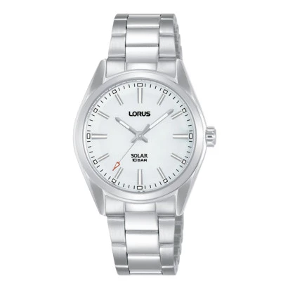 Reloj Lorus solar RY503AX9 para mujer. Movimiento Japonés fron SEIKO. Calibre as01. Caja y brazalete de acero, brazalete cierre de mariposa. Esfera en blanco con índices y agujas luminiscentes, tres agujas. Cristal mineral. WR 10 bar, resistente 100 metros. Medida de caja de 31 milímetros. Estuche y garantía oficial Lorus