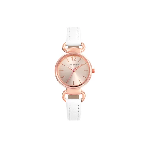Reloj Viceroy con caja de acero chapado oro rosa y correa de piel cuero blanco con hebilla en rosa de Viceroy, esfera de color claro con índices y agujas en rosé, reloj comunión. Reloj tipo joya.