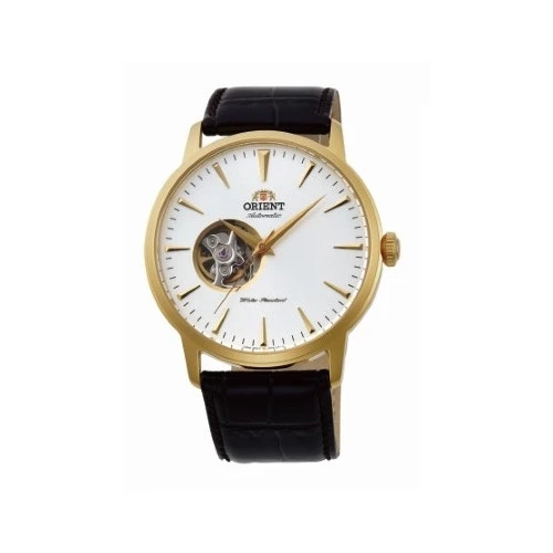 Reloj Orient automático para hombre en acero dorado y piel, esfera blanca índices y agujas finas doradas maquinaria vista fag02003w0 calibre f6t22, garantía Orient