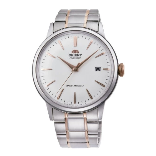 Reloj Orient automático para hombre en acero bicolor rose, esfera blanca con índices y agujas en rose, cristal bombé calibre F6724, ra-ac0004s10b, garantía Orient