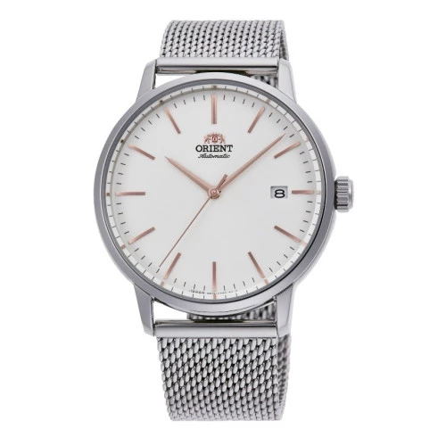 Reloj Orient automático elegante ra-ac0e07S10b para hombre caja y brazalete en acero malla milanesa esfera en blanco, calibre f6722, garantía Orient