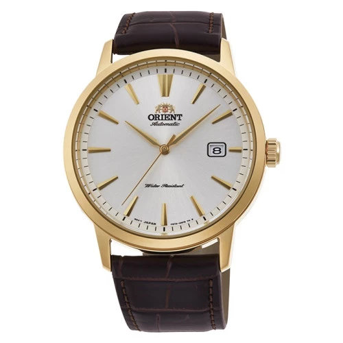 Reloj Orient automático elegante ra-ac0f04s10b para hombre caja en acero dorado con esfera en blanco y correa de piel marrón, calibre f6722, garantía Orient