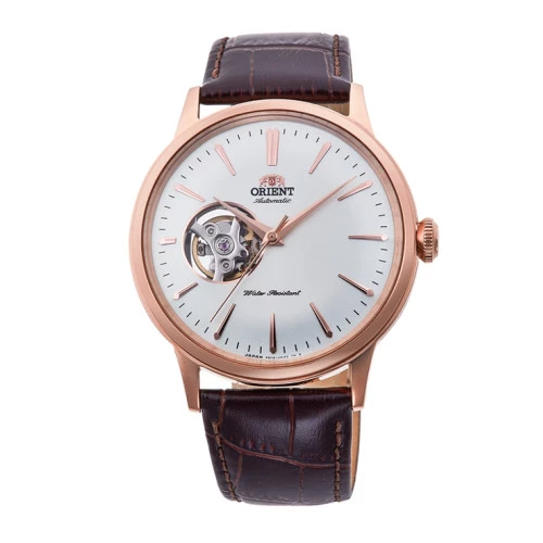 Reloj Orient automático para hombre en acero rose y piel, esfera blanca índices y agujas finas doradas maquinaria vista ra-ag0001s10b calibre f6t22, garantía Orient