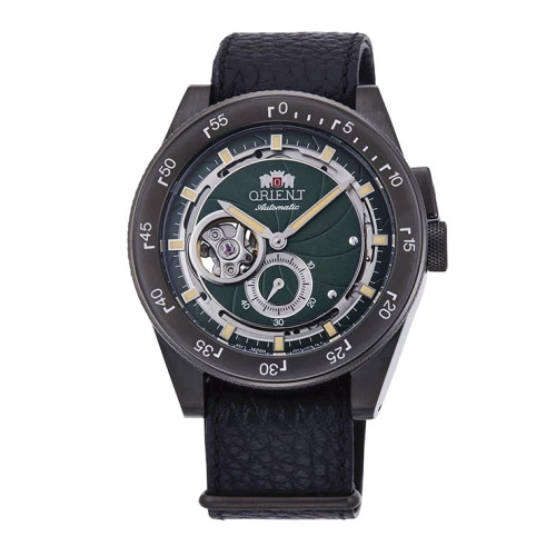 Reloj Orient automático ra-ar0202e para hombre retro future camara en acero y piel, esfera en verde y agujas e índices luminiscentes, calibre f6s22, garantía Orient