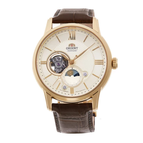 Reloj Orient automático para hombre en acero dorado y piel marrón, esfera con maquinaria vista y sol luna, cristal zafiro ra-as0010s10b calibre f6l24, garantía Orient RA-AS0010S30B