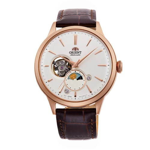 Reloj Orient ra-as0102s10b automático bambino para hombre en acero rosa y correa piel marrón, esfera con maquinaria vista y sol luna, calibre f6l24, garantía Orient.