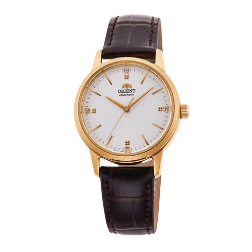 Reloj Orient automático ra-nb0104s10b para mujer. Orient made in Japan. Movimiento mecánico: Orient calibre 55542 automático y de cuerda remonte manual, reserva de 40 horas aproximadamente. Reloj automático con caja de acero dorado y correa de piel marrón. Esfera en blanco con agujas e índices finos en dorado, piedras en doce, tres, seis y nueve. Cristal mineral. Tapa cerrada a rosca. Caja de 32 milímetros de diámetro y grueso de 10,4 milímetros. Resistente al agua 100 metros Trae estuche Orient y garantía oficial Orient.