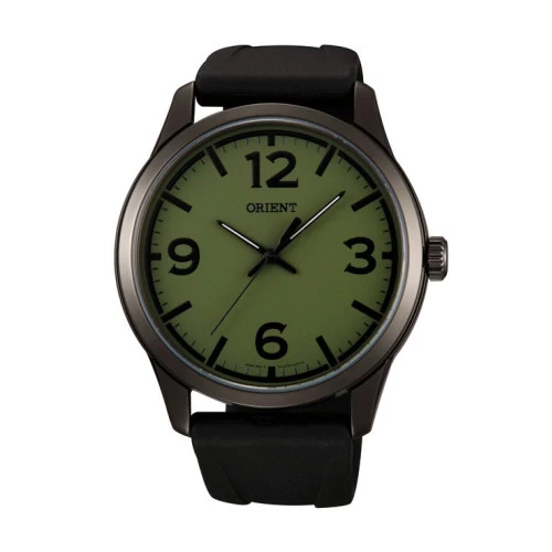 Reloj Orient FQC0U008F0 tres agujas para hombre military. Movimiento de cuarzo pila: Orient calibre RH500 Made Japan. Reloj con caja de acero negro, correa de caucho, esfera en color verde con números arábigos. Agujas luminiscentes. Cristal mineral. Tapa cerrada a rosca. Diámetro de caja de 43 milímetros y grueso de 9 milímetros. Resistente al agua 50 metros. Trae estuche y garantía oficial Orient.