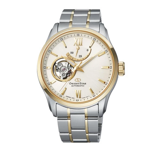 Reloj Orient Star re-at0004s00b. Reloj automático en acero bicolor, con esfera clara, agujas e índices en dorado finos y elegantes. Cristal zafiro bombé resistente a arañazos. Diámetro de caja de 39 milímetros y grueso de 13,10 milímetros. Brazalete de acero bicolor con cierre desplegable con doble pulsador. Resistente al agua 50 metros. Movimiento mecánico: Orient calibre f6r42. Relojería Made in Japan, 21 rubíes, 21,600 vibraciones hora. Reloj con indicador de reserva de marcha de 50 horas en esfera en la posición de las doce. Semi esqueleto en la posición de las nueve. Mecanismo de detención de segundero. Trae estuche Orient Star y garantía oficial Orient.