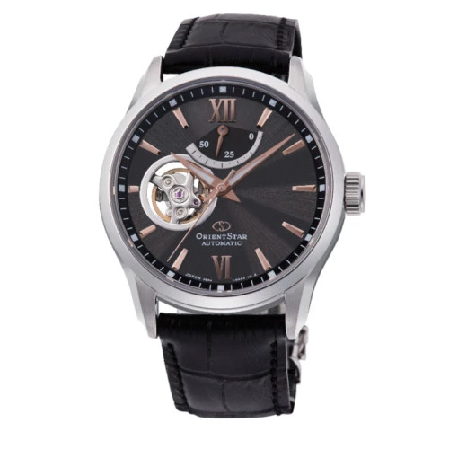Reloj Orient Star re-at0007n00b. Reloj automático en acero y piel. Cristal de zafiro con esfera en marrón, agujas e índices en dorado rose luminiscentes. Ventana semi eskeleton en la posición de las nueve. Correa de piel en marrón con cierre desplegable con doble pulsador. Caja de 39 milímetros. Cristal de zafiro antirreflejos. Resistente al agua 50 metros. Movimiento mecánico: Orient calibre f6r42. Relojería Made in Japan, 21 rubíes, 21,600 vibraciones hora, reserva de marcha de 50 horas, indicador en la posición de las doce, mecanismo de detención de segundero. Estuche y garantía oficial Orient Star.