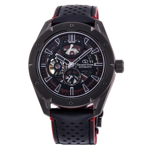 Orient Star re-av0a03b00b mecanismo automático mecánico. Semi skeleton. Movimiento mecánico: Orient calibre f6f44. Relojería Made in Japan. 21 rubíes. 21,600 vibraciones hora. Reloj con reserva de marcha de 50 horas, mecanismo de detención de segundero. Reloj automático con caja de acero macizo en negro, esfera en negro. Correa en piel negra y roja con cierre deployante Orient. En esfera indicador de reserva de carga a las doce. Esfera segundos a las seis y ventana en las nueve y dos donde se aprecia mecanismo. Tapa acristalada cerrada a rosca. Cristal de zafiro irrayable. Orient con medida de caja de 43,2 milímetros y grueso de 13,7 milímetros. Resistente al agua 50 metros Trae estuche Orient Star y garantía oficial Orient.