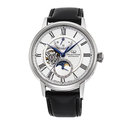 Reloj Orient Star re-ay0106s00b automático en acero y piel, cristal zafiro, esfera blanca, fase lunar, reserva de marcha 50 horas con calibre f7m63, para hombre con garantía Orient.