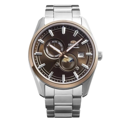 Reloj Orient Stretto RA-AK0313Y30B para hombre Sol y Luna en acero esfera marón, f6722, estuche y garantía Orient.