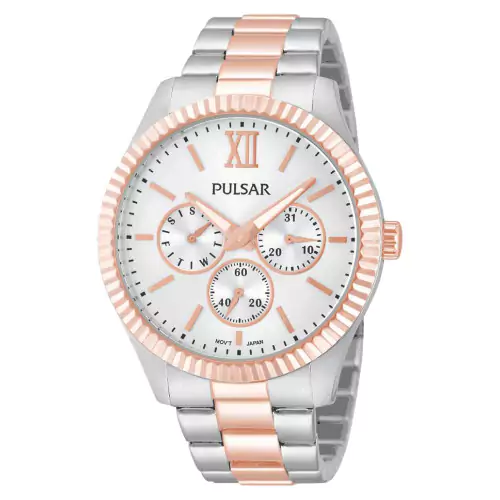 Reloj Pulsar pp6126x1 multifunción, calibre vd75 con caja y brazalete de acero bicolor rosa, esfera en gris perla. Garantía Pulsar, movimiento japones