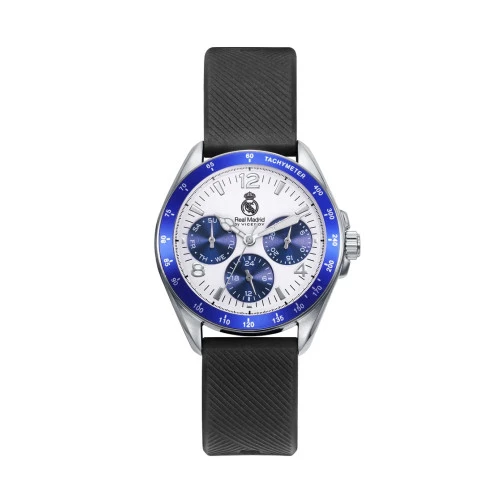 Reloj Real Madrid para cadete 41129-05. Reloj tamaño cadete medida de caja de 39 milímetros, con caja de acero y correa de caucho en negro, con cierre de hebilla Real Madrid de seguridad. Esfera en blanco con tres esferas en azul multifunción, agujas luminiscentes números arábigos. Bisel en aluminio en azul, contador de segundos. Tapa cerrada a rosca donde aparece con el escudo del Real Madrid que tanto gusta a sus seguidores. Resistente al agua 100 metros. Trae estuche producto oficial Real Madrid personalizado del Real Madrid. Garantía oficial Viceroy