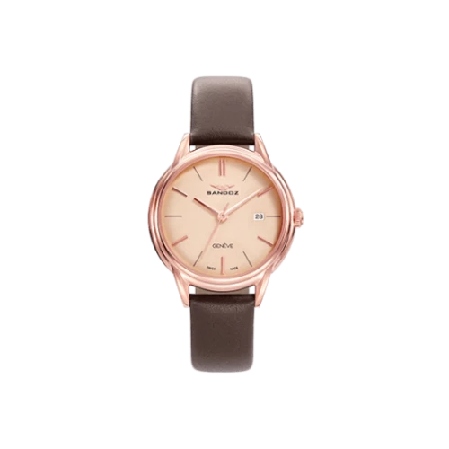 Reloj Sandoz para mujer 81354-97 tres agujas suizo en acero ip rosado con esfera rosado y correa de piel en marrón, calendario. Colección Heritage. Estuche y garantía Sandoz