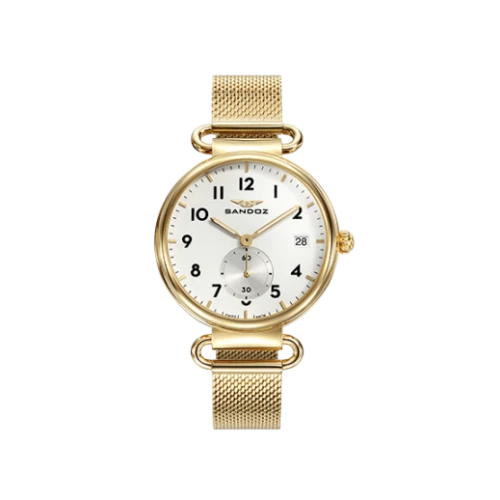 Reloj Sandoz 81360-04 para mujer en acero dorado con esfera en blanco, números arábigos e índices en dorado elegantes, calendario, swiss made. Estuche y garantía Sandoz