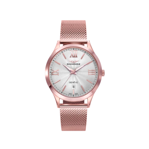 Reloj Sandoz 81366-03 para mujer en acero ip rosa, fácil de ver la hora esfera color plata índices números romanos y elegantes en rosa, calendario, swiss made. Estuche y garantía Sandoz