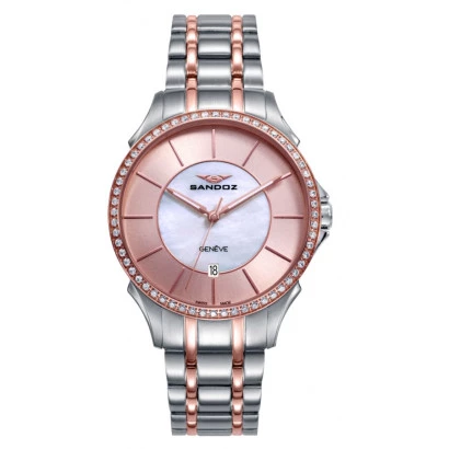Reloj Sandoz 81372-97 swiss made para mujer en acero bicolor rosa plateado con piedras, esfera madreperla con índices finos y elegantes, estuche y garantía Sandoz