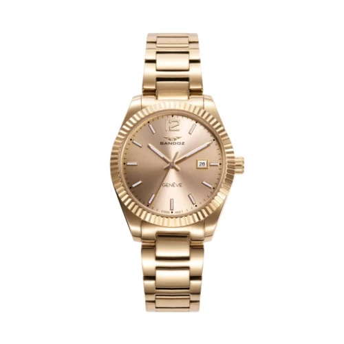 Reloj Sandoz 81384-25 reloj suizo para mujer colección Casuel. Maquinaria de precisión suiza swiss made. Caja de acero sólido dorado con bisel troquelado dorado y brazalete acero sólido dorado con cierre desplegable oculto. Esfera en dorado con agujas e índices finos y elegantes en dorado. Calendario en la posición de las tres. Fondo cerrado a rosca, 100 metros. Diámetro de caja de 32 milímetros. Cristal zafiro irrayable. Estuche y garantía Sandoz