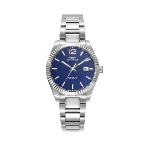 Reloj Sandoz 81384-35 reloj suizo para mujer colección Casuel. Maquinaria de precisión suiza swiss made. Caja de acero sólido con bisel troquelado plateado brillo y brazalete acero sólido con cierre desplegable oculto. Esfera en azul con agujas e índices finos y elegantes en plateado. Calendario en la posición de las tres. Fondo cerrado a rosca, 100 metros.. Diámetro de caja de 32 milímetros. Cristal zafiro irrayable. Estuche y garantía Sandoz