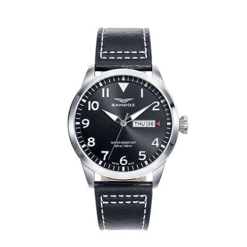 Reloj Sandoz para hombre 81421-55 pilot swiss made en acero y piel esfera en negro, doble calendario, 100 metros, swiss made, estuche y garantía Sandoz