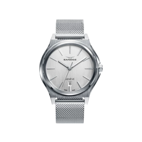 Reloj Sandoz para hombre 81481-07 tres agujas suizo en acero caja y brazalete milanesa, esfera gris, calendario, Dynamique. Estuche y garantía Sandoz