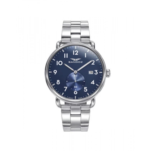 Reloj Sandoz para hombre 81495-34 suizo en acero caja y brazalete, esfera en azul, calendario, números arábigos, tres agujas. Estuche y garantía Sandoz