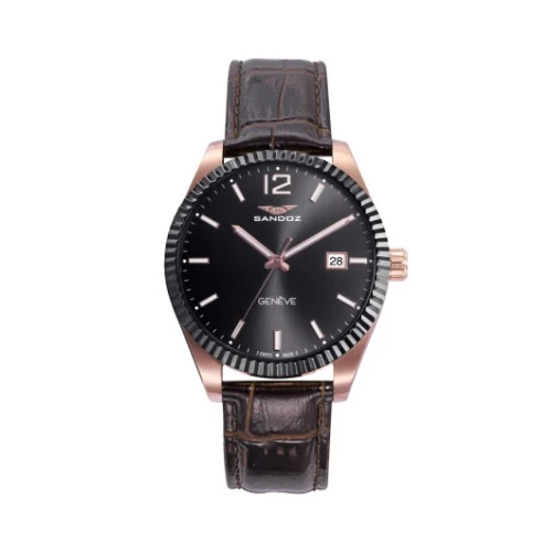 Reloj Sandoz 81523-55 reloj suizo para hombre colección Casuel. Maquinaria de precisión suiza swiss made. Caja de acero sólido dorado rosa con bisel troquelado en negro y correa de piel marrón con pespuntes. Esfera en negro con agujas e índices finos y elegantes en dorado rosa. Calendario en la posición de las tres. Fondo cerrado a rosca, 100 metros.. Diámetro de caja de 41 milímetros. Cristal zafiro irrayable. Estuche y garantía Sandoz
