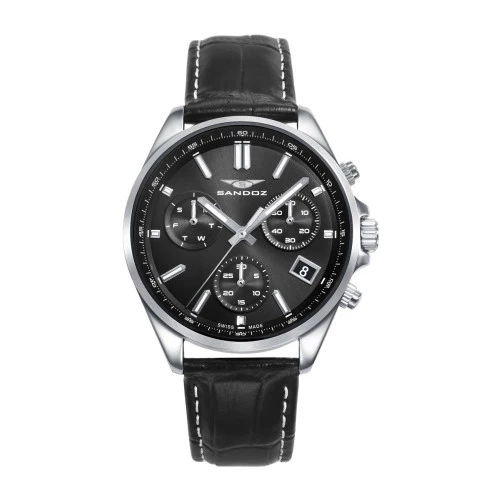 Reloj Sandoz para hombre 83007-57 cronógrafo en acero y piel esfera negra, calendario. Swiss made. Garantía Sandoz