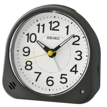 Reloj Seiko despertador qhe188k. Reloj con caja de plástico de calidad en negro. Esfera en blanco con índices números arábigos y agujas en luminiscentes, aguja alarma en plateado. Segundero de barrido silencioso, luz. Alarma zumbador de repetición. Medida del despertador 11,3 x 11,6 x 6,6 cm. Garantía oficial Seiko