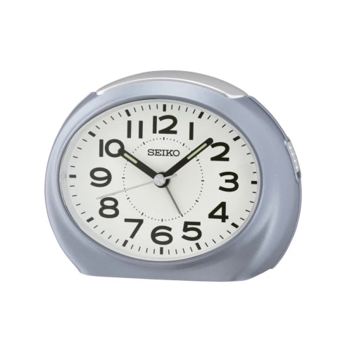 Reloj Seiko despertador qhe193l. Reloj con caja de plástico de calidad en azul claro ovalado. Esfera en blanco con índices números arábigos y agujas en luminiscentes, aguja alarma en plateado. Segundero de barrido silencioso, luz. Alarma zumbador de repetición, indicador de alarma. Medida del despertador 8,8 cm alto x 6,8cm fondo x 11,2 de ancho cm. Garantía oficial Seiko