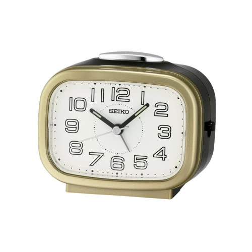 Reloj Seiko despertador QHK060G cuadrado 9,9 cm silencioso, caja de plástico en dorado, números arábigos, alarma zumbador, garantía Seiko