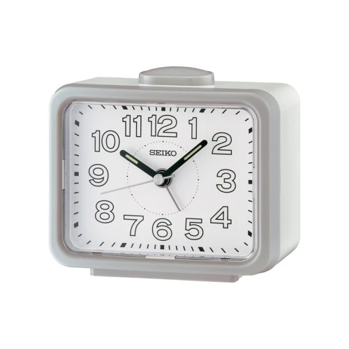 Reloj Seiko despertador QHK061N cuadrado 10,9 cm silencioso, caja de plástico en gris, números arábigos, alarma zumbador, garantía Seiko