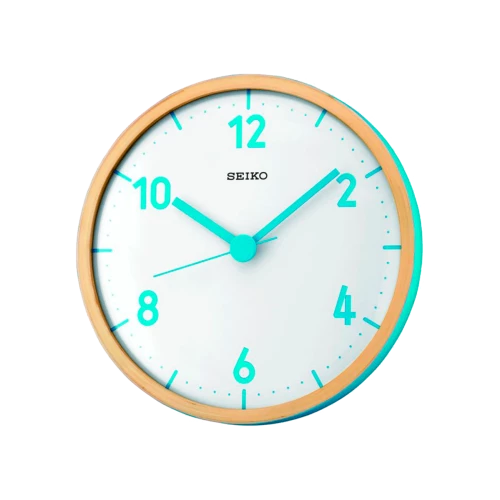 Reloj de pared Seiko qxa533l marrón claro madera esfera en blanco y números arábigos verde con medidas de 26 centímetros de diámetro, garantía Seiko