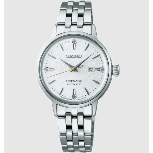 Reloj Seiko mujer SRE017J1 Presage Cocktail Hot Buttered Rum Cow. Reloj Seiko con calibre 2R05 Automático, 29 rubíes, 21.600 alternancias por hora, 200 componentes. con 41 horas de reserva de carga, capacidad de cuerda manual. Calendario día del mes en esfera en la posición de las tres. Esfera en blanco, agujas e índices en plateado finas y elegantes, segundero en dorado con cuatro diamantes. Caja y brazalete de acero con cierre deployante. Fondo cerrado a rosca transparente donde se aprecia masa oscilante en dorado. Cristal hardlex bombé con forma de la caja. Resistente al agua 50 metros. Diámetro de la caja 30,3 milímetros. Estuche y garantía Seiko.