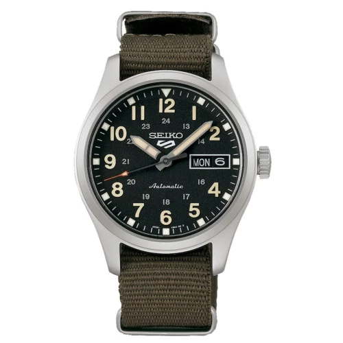 Reloj Seiko 5 SRPJ85K1 automático 36 mm military. Reloj Seiko con calibre 4r36, detención parada de segundero. Automático, 24 rubíes, 21.600 alternancias por hora con 41 horas de reserva de carga. Esfera negra, tres agujas, agujas e índices números arábigos luminiscentes, doble calendario en la posición de las tres. Caja de acero con corona cambio de hora y fecha en la posición de las tres, correa de nylon en verde, fondo cerrado a rosca caja transparente. Cristal Hardlex. Resistente al agua 100 metros. Diámetro de la caja 36 milímetros. Estuche y garantía oficial Seiko