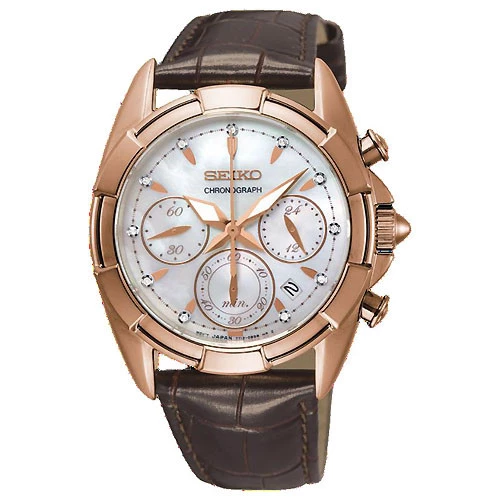 Reloj Seiko srw784p1 para mujer, caja acero rosa y correa de piel, cristal zafiro, esfera madreperla con 11 diamantes, calibre 7t12, garantía y estuche Seiko