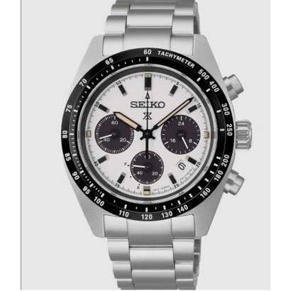 Reloj Seiko SSC961P1 solar Prospex speedtimer unisex panda. Reloj Seiko con calibre v192, autonomía de 6 meses en la oscuridad a plena carga, pre aviso de agotamiento de carga y prevención de sobrecarga. Movimiento solar, impulsado por la luz sin necesidad de cambio de pila. Caja de acero con bisel en negro con taquímetro. Brazalete de acero con cierre triple con cierre seguro botón de apertura. Cristal zafiro curvado con revestimiento anti reflectante. Esfera en blanco con agujas e índices luminiscentes. Calendario en la posición de las cuatro y media. Esfera con indicación de las 24 horas en las tres. Cronógrafo hasta 60 minutos en incremento de 1/5 de segundo, medida de tiempos parciales transcurridos. 10 bares. Diámetro de caja de 39 milímetros y grueso de 13,3. Peso de 160 gramos. Estuche y garantía oficial Seiko