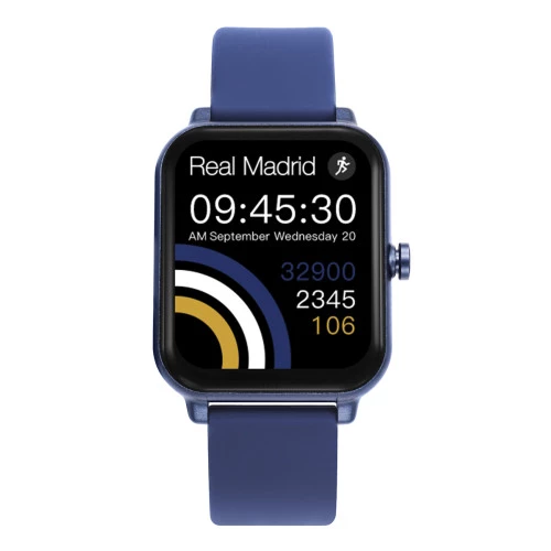 Reloj Smart Watch Real Madrid RM2001-30 producto oficial Real Madrid. Caja en azul rectangular con correa silicona en azul. En la tapa aparece con el escudo del Real Madrid que tanto gusta a sus seguidores. Android 5.0+ (excepto Go edition), iOS 10.0+. Las funciones pueden variar entra plataformas y países. Trae incluido cable carga USB y garantía. Funciones: Oxígeno en sangre, Presión arterial, distancia, Mensajes, aviso de llamadas, clima, control musical, cámara remota, gestión de sueño, alarma, calorías, gestión de deportes, linterna, podómetro, cronógrafo,, control de estés, aviso sedentarismo, localizador de teléfono, ciclo menstrual, temporizador, frecuencia cardiaca, y seguimiento GPS en App. Todo un reloj para la vida cotidiana.