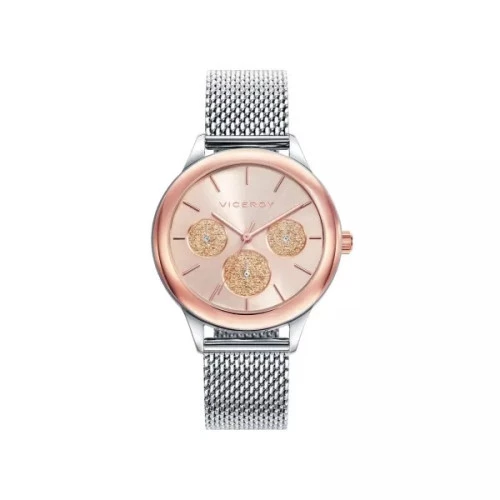 Reloj Viceroy 401036-97 reloj pulsera colección Chic multifunción en acero para mujer. Esfera en dorado ip rosa con índices y agujas finos y elegantes en rosa. esferas de multifunción en purpurina dorada. Brazalete en acero malla milanesa con cierre deslizante Viceroy de seguridad. Fondo cerrado a presión. Tamaño de reloj para mujer con medida de 36 milímetros. Resistente al agua. Estuche y garantía Viceroy