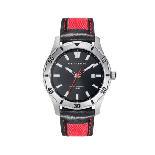Reloj Viceroy 401129-97 para hombre colección Heat. Caja de acero con correa de piel y nylon canvas en rojo con pespuntes rojos, cierre de hebilla de seguridad. Esfera en color negro. Agujas e índices de las horas luminiscentes, aguja del segundero en rojo. Calendario en la posición de las tres. Resistente al agua 100 metros. Tamaño para hombre 43 milímetros. Estuche y garantía oficial Viceroy