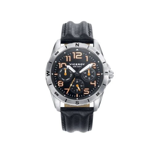 Reloj Viceroy con caja de acero, en bisel puntos cardinales en negro, con esfera de color negra y números arábigos en naranja