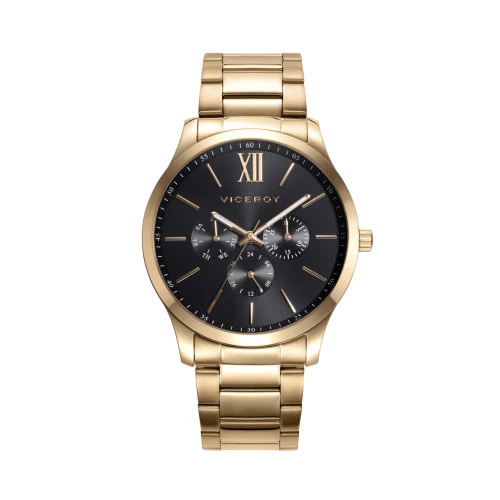 Reloj Viceroy 401187-93 multifunción para hombre en acero dorado caja y brazalete, esfera en negro calendario día mes y semana, estuche y garantía Viceroy